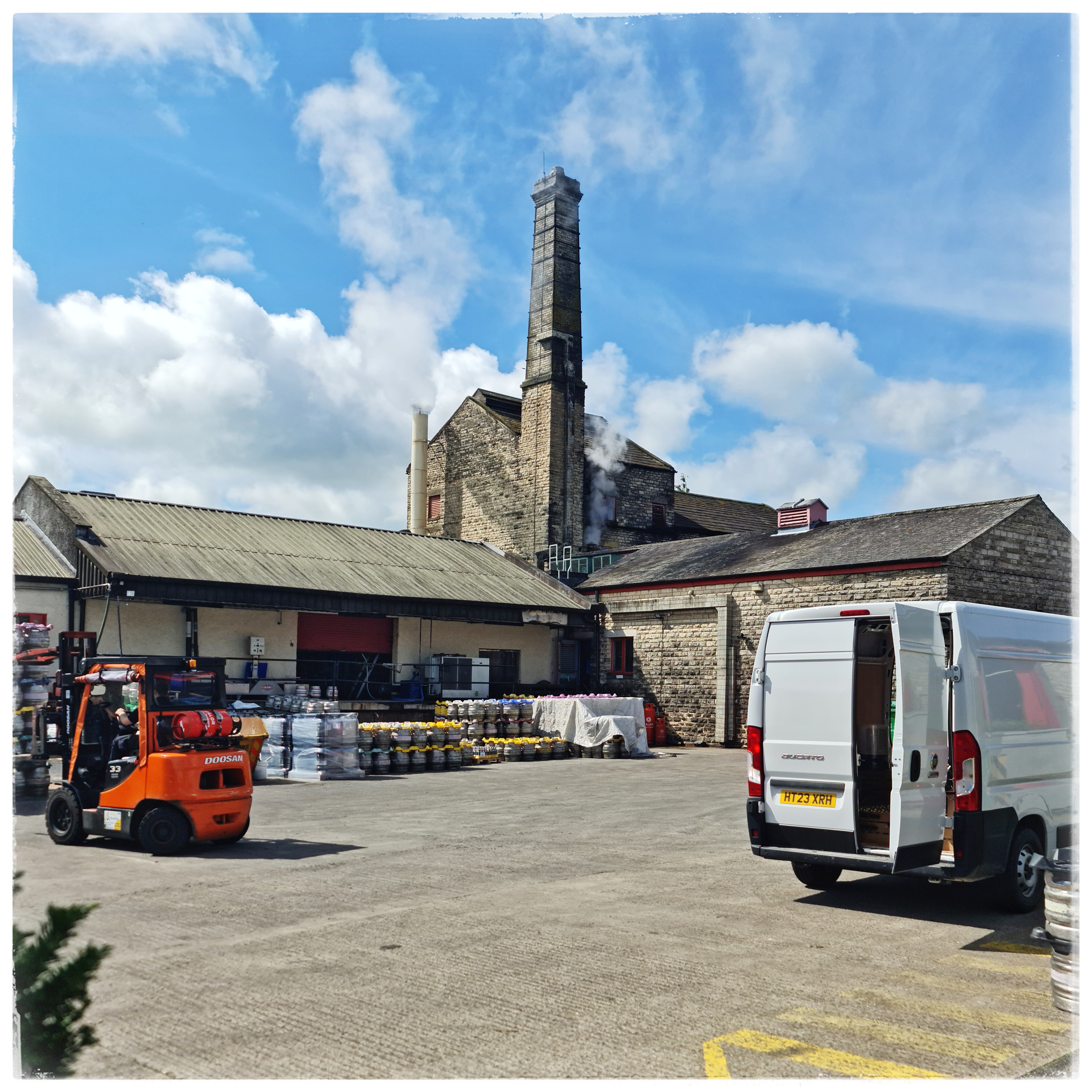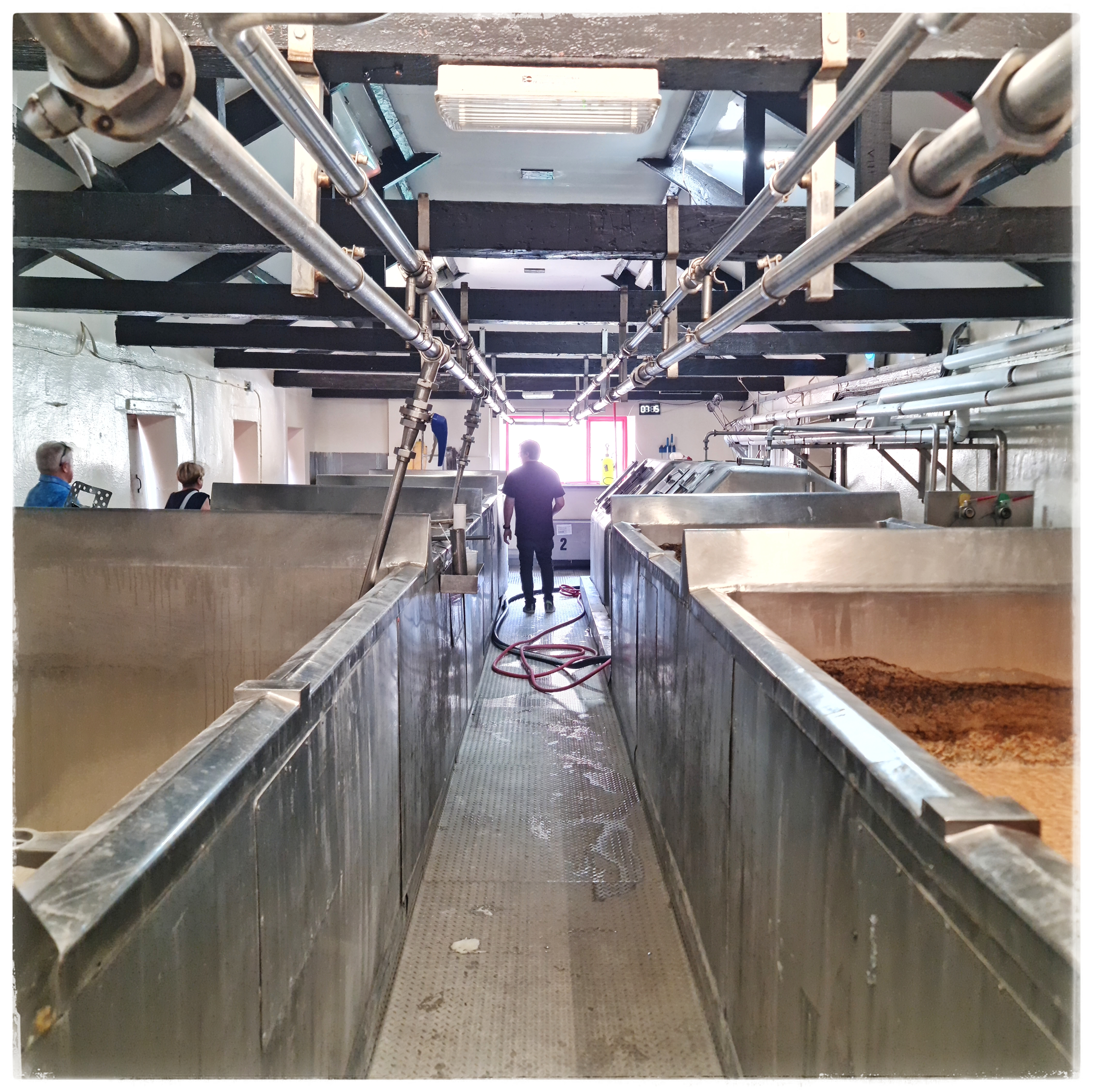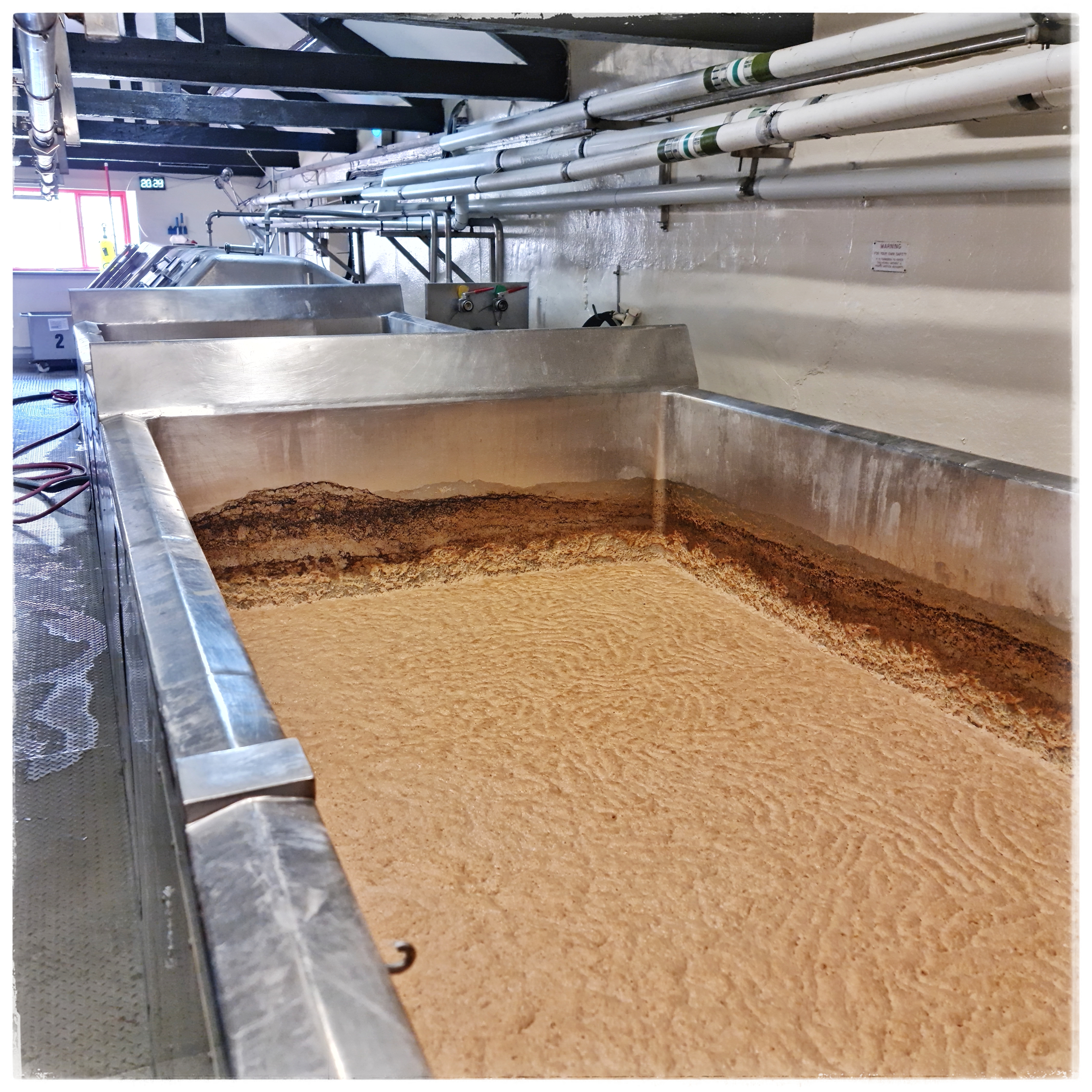Nachdem wir 2023 die Brewery-Tour bei Black Sheep gemacht haben, waren wir heute bei Theakston. Es handelt sich dabei um eine von drei noch betriebenen Viktorianischen Turm-Brauereien (die anderen sind Hook Norton in den Cotswolds und Harvey’s in Lewes bei Bighton). Turm deswegen, weil der Brauprozess der Schwerkraft folgend von oben nach unten erfolgt: unterm Dach schroten, eine Etage darunter Maischen und Würzekochen, wieder eine darunter im „Hop Back“ den Hopfen von der Würze trennen, also Läutern, wobei weiterer Hopfen zur Aromatisierung hinzugefügt werden kann. Von dort geht es weiter durch den Würzekühler in die Gärbottiche.