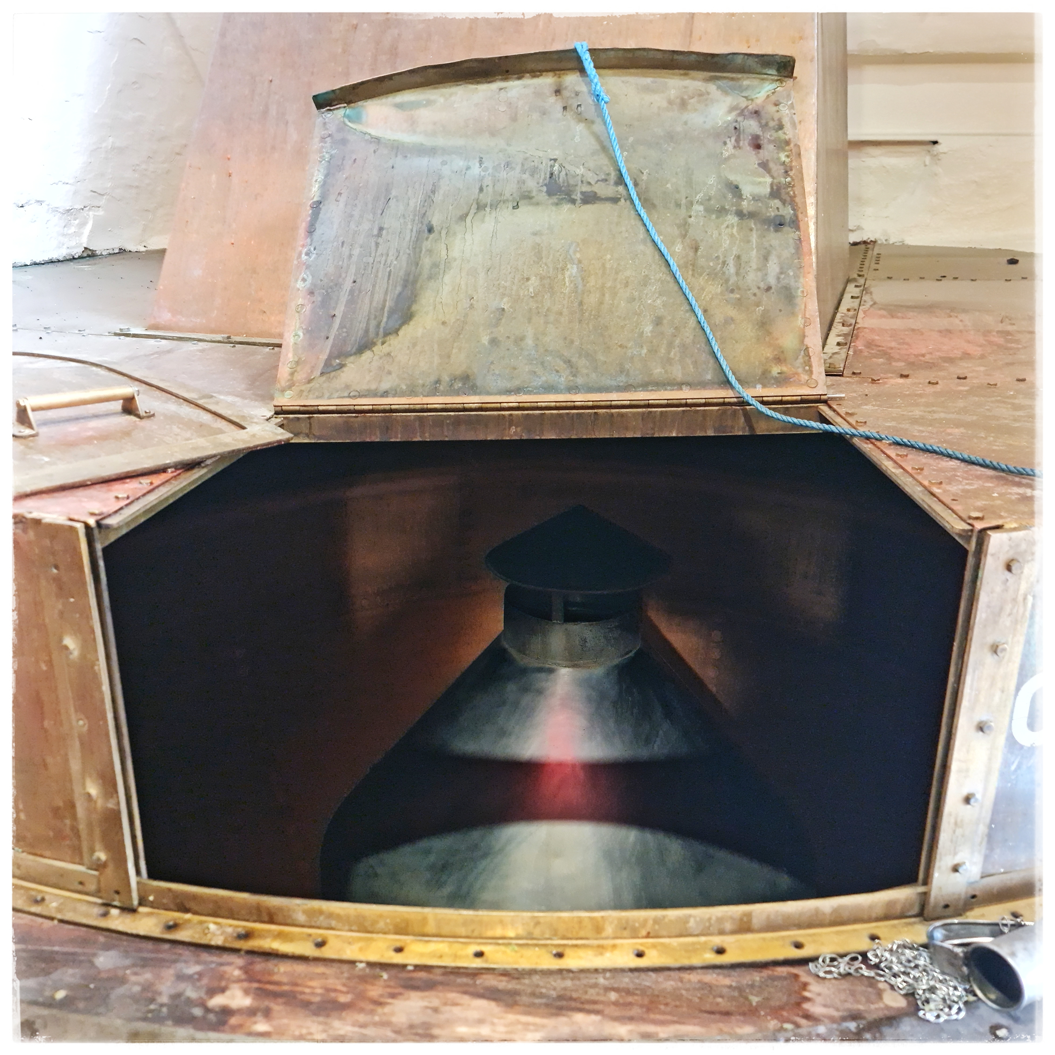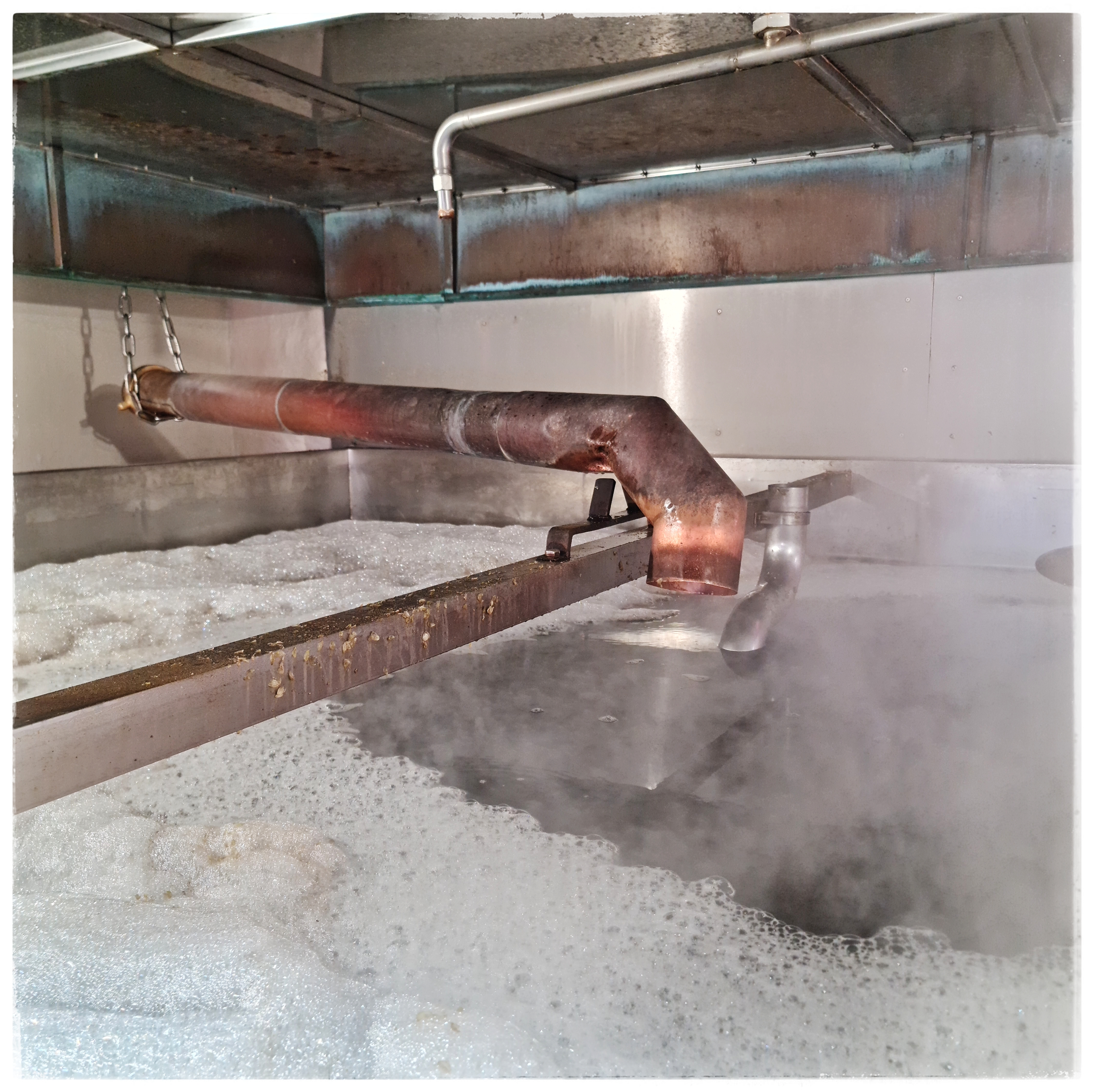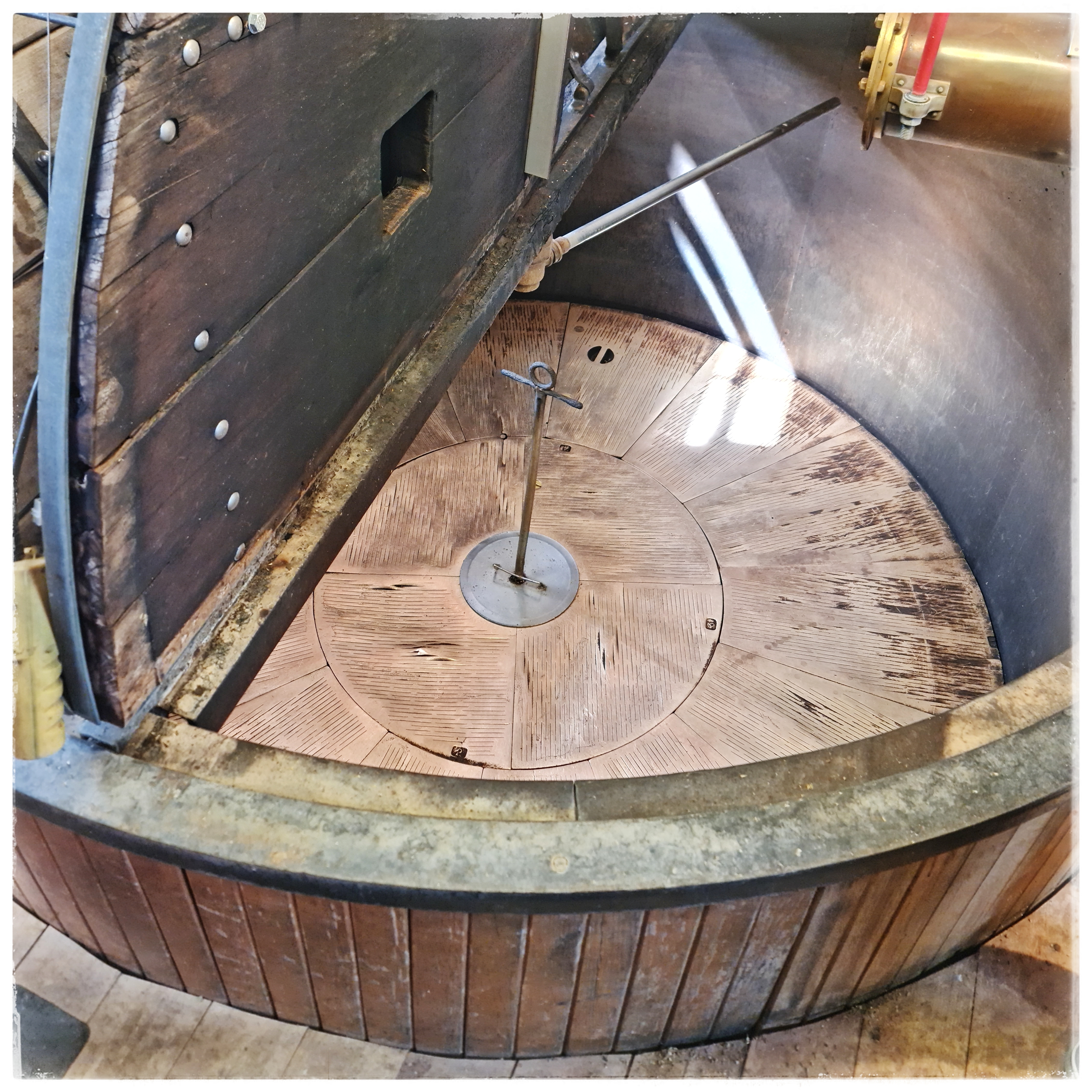 Nachdem wir 2023 die Brewery-Tour bei Black Sheep gemacht haben, waren wir heute bei Theakston. Es handelt sich dabei um eine von drei noch betriebenen Viktorianischen Turm-Brauereien (die anderen sind Hook Norton in den Cotswolds und Harvey’s in Lewes bei Bighton). Turm deswegen, weil der Brauprozess der Schwerkraft folgend von oben nach unten erfolgt: unterm Dach schroten, eine Etage darunter Maischen und Würzekochen, wieder eine darunter im „Hop Back“ den Hopfen von der Würze trennen, also Läutern, wobei weiterer Hopfen zur Aromatisierung hinzugefügt werden kann. Von dort geht es weiter durch den Würzekühler in die Gärbottiche.
