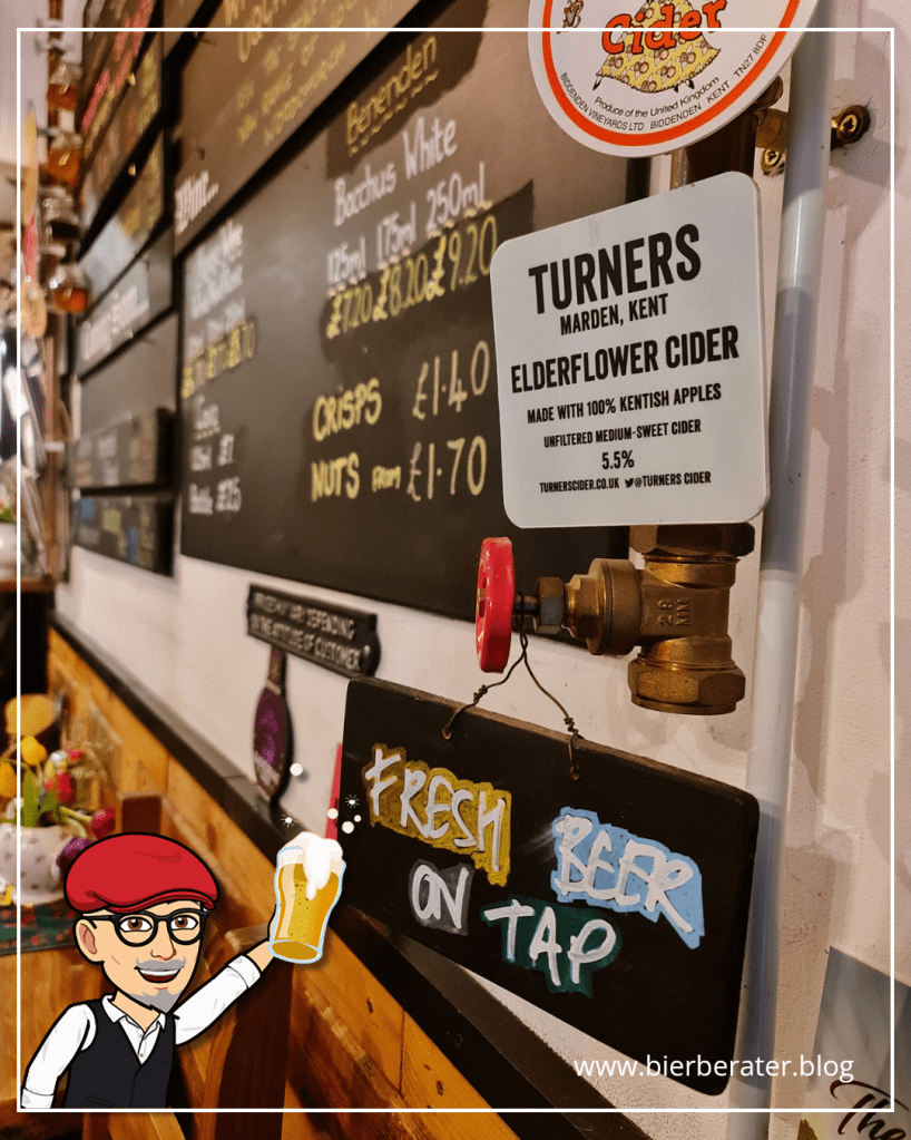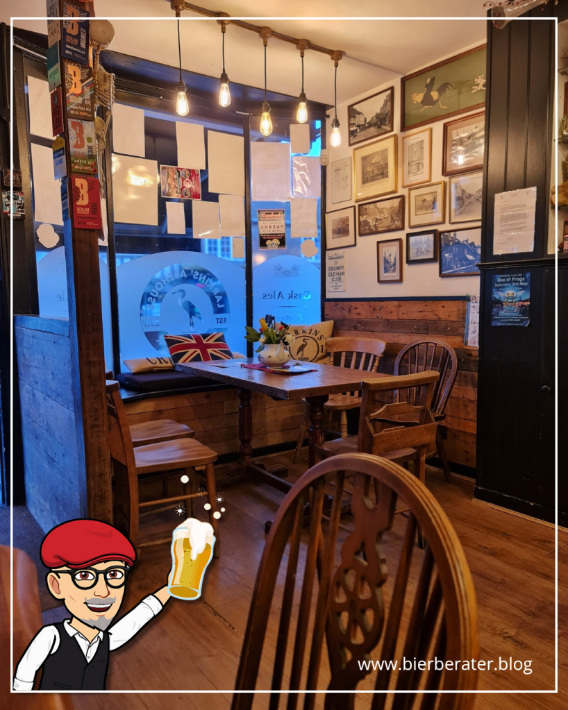 Es fängt schon mit der Einrichtung an. Im schmalen und langgezogenen Gastraum stehen vier Tische zwischen Bänken und Stühlen – hölzern, robust, einfach und zweckmäßig, abgenutzt, einladend mit Blumen und Tischdecken geschmückt, liebevoll und familiär. Rund 20 Gäste können bequem sitzen, wenn sie zusammenrücken auch mehr. Vom Eingang aus fällt der Blick zunächst auf eine kleine Theke, die so ganz anders aussieht als die üblichen Kneipentheken: sie hat keine Zapfhähne. Stattdessen stehen dort große Gläser gefüllt mit verschiedenen Sorten Erdnüssen und Pistazien sowie zwei Gläser mit hell und dunkel eingelegten Soleiern. Wände und Decken sind übersät mit Pumpclips, bierdeckelgroßen Schildern, die üblicherweise an die hier nicht vorhandenen Zapfhähne geklemmt werden, damit der Kunde angesichts des unentwegt wechselnden Angebotes weiß, welche Biere gerade ausgeschenkt werden. Sie werden von den Brauereien mit den Fässern mitgeliefert. In dieser Kneipe wird das Angebot auf Schiefertafeln geschrieben, die rechts neben dem Eingang angebracht sind. Neben den aktuell verfügbaren Bieren steht dort auch eine Übersicht der Cider und Weine, die man bestellen kann. Die Getränke – außer dem Wein – werden direkt aus Fässern im gekühlten Nebenraum gezapft. Kurz: Alles in meiner Lieblingskneipe hat den soliden, gemütlichen und schönen Charme eines dörflichen Micropubs des 21. Jahrhunderts, wobei das Zapfen aus Fässern an die gute alte Kneipenkultur des 19. Jahrhunderts erinnert.